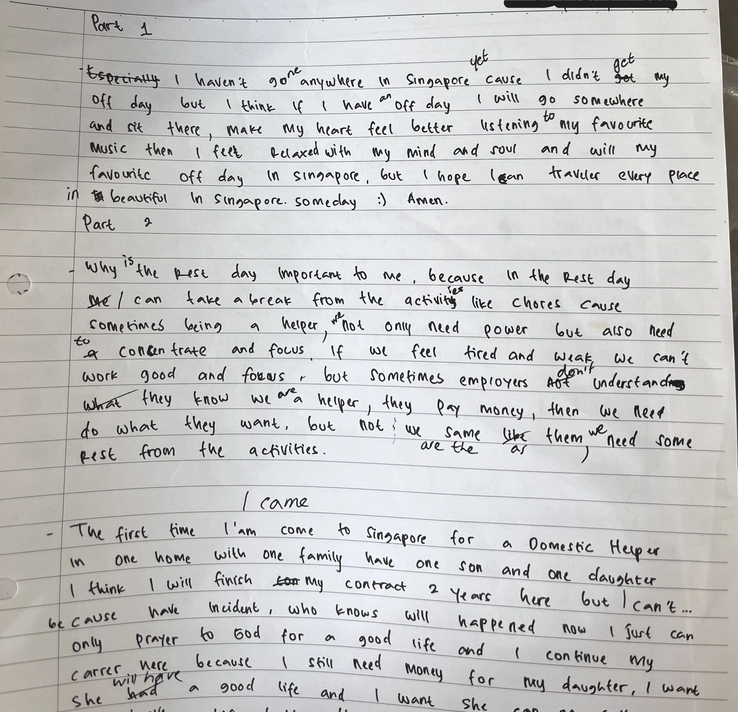 “I have worked in Singapore for about six years already. In my last job, I took care of three children, that are all boys. My employer’s house is four stories, and I got very tired working there. I had a day off once a month only, and then I could meet with my friends. I told my friends about my job, and how I was always tired. And how my employer was always angry with me. My friends supported me in my struggles and gave me strength. I told my employer I did not want to work with them anymore, but they said I had to finish my contract. When I told them my mother was sick and I had to go home, they said I needed to wait for two months so they could hire another domestic worker. I asked them to let me go and said I’d wait one month for them to find another domestic worker. But they said no, and my sir took my phone away and did not let me go out anymore. I could not even call my mother for two weeks. By the time he gave back my phone she had already passed away. I felt very sad and lonely. When my employer didn’t pay my salary for two months, I called my agency for help and they sent me to HOME shelter. Now I am here I feel so happy, my mind is free. I can meet my old friends. They tell me to take care, and be strong, and that they will always be there for me. My day off is very important to me. A day off can make you happy, and free your mind.”