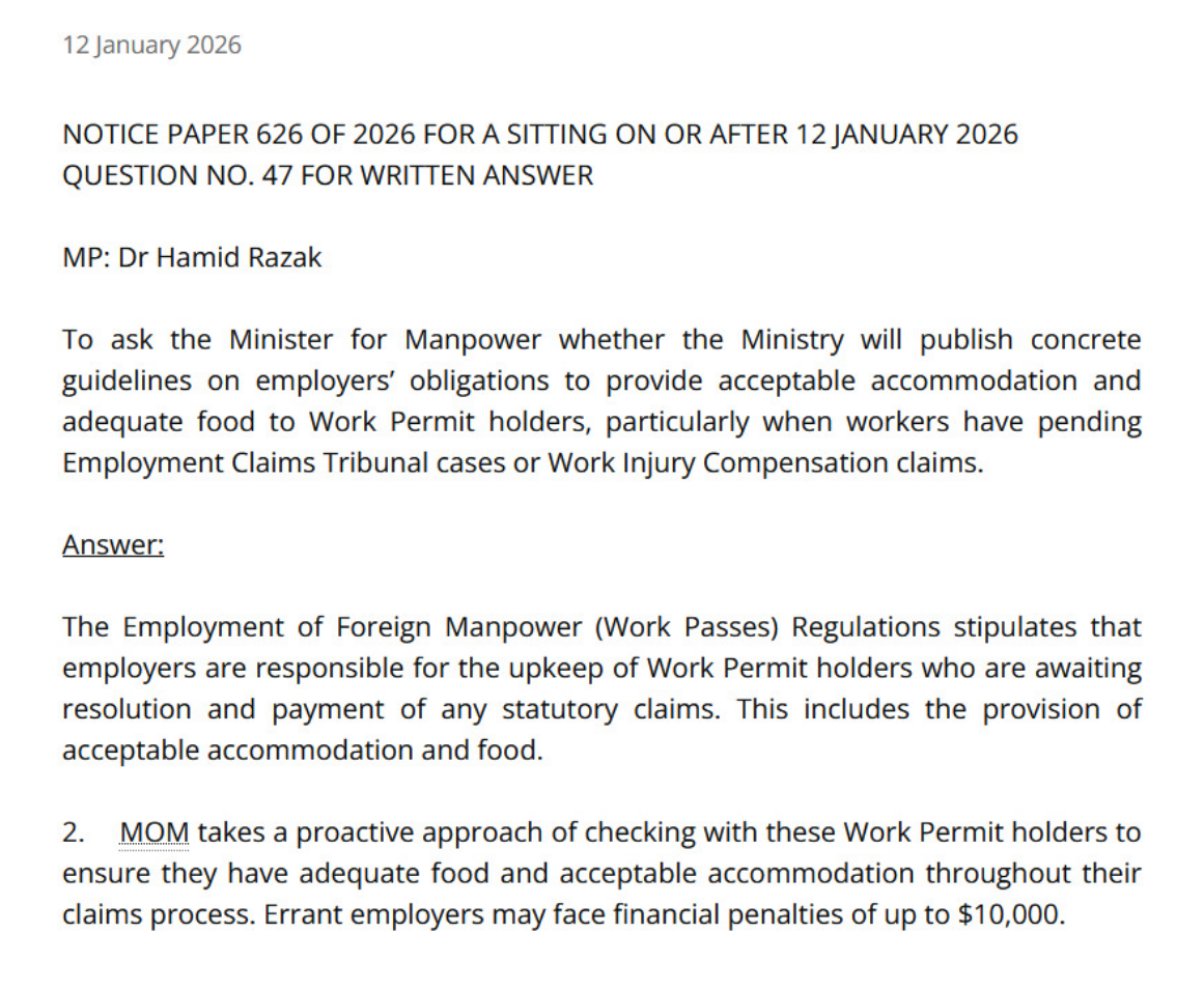 In January 2026, MP Hamid Razak filed a Parliamentary Question on the publication of concrete guidelines for accommodation and food for workers pursuing statutory claims against their employers. In its response, the Ministry of Manpower (MOM) stated that employers are required to provide “acceptable” accommodation and food, and that MOM adopts a “proactive approach” by checking in with affected Work Permit holders to ensure they continue to receive adequate food and acceptable accommodation throughout the claims process.